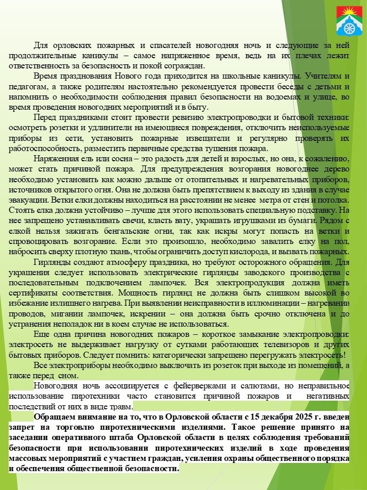 Новый год и Рождество – долгожданные праздники, наполненные радостью и весельем. Однако именно в этот период возрастает риск возникновения чрезвычайных ситуаций. Чтобы избежать неприятностей и сделать праздничные дни безопасными, Главное управление МЧС России по Орловской области рекомендует соблюдать ряд простых, но важных правил.
