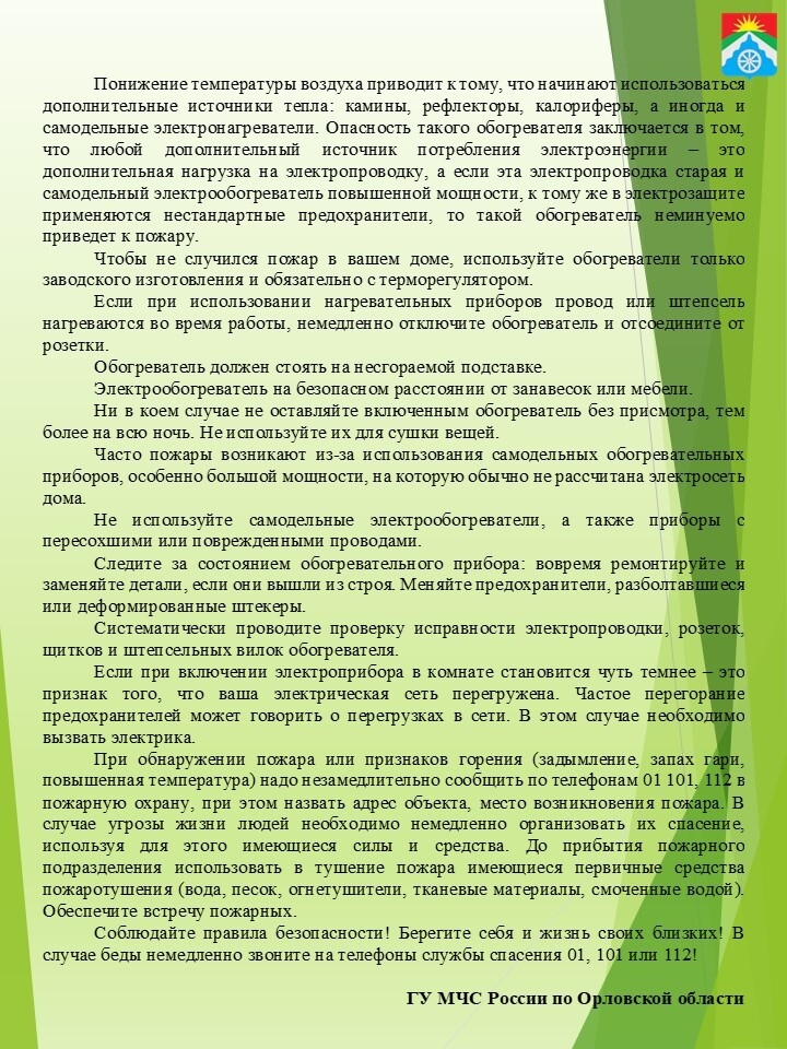 Ежегодно в зимний период с понижением температуры воздуха фиксируется увеличение количества пожаров, связанных с использованием электроприборов и отопительного оборудования. В связи с приходом морозной погоды Главное управление МЧС России по Орловской области обращает внимание населения на усиление мер пожарной безопасности в жилом секторе.