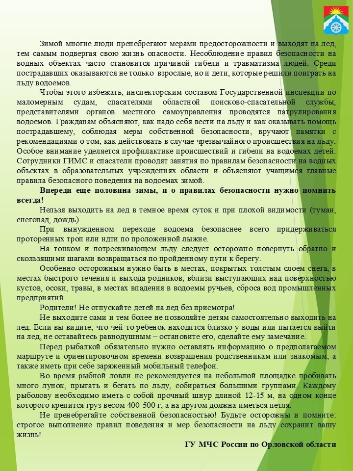В зимний период увеличивается риск происшествий из-за выхода на лед водоемов. Трагедия может произойти из-за детской шалости, во время рыбалки или просто при переходе по льду. Для недопущения происшествий на водных объектах инспекторами Государственной инспекции по маломерным судам Главного управления МЧС России по Орловской области проводятся профилактические мероприятия.