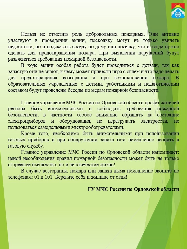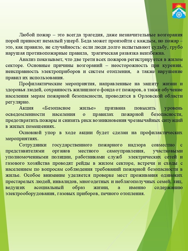 Чтобы привлечь внимание жителей Орловской области к проблеме пожаров, напомнить им о необходимости соблюдения правил пожарной безопасности, с 16 февраля по 16 марта в регионе проводится профилактическая акция «Безопасное жилье».